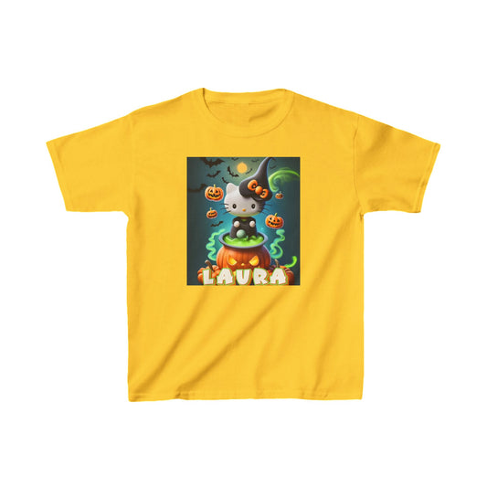 Personalized Halloween Hello Kitty Kids Heavy Cotton Tee – Custom Name Witch Design