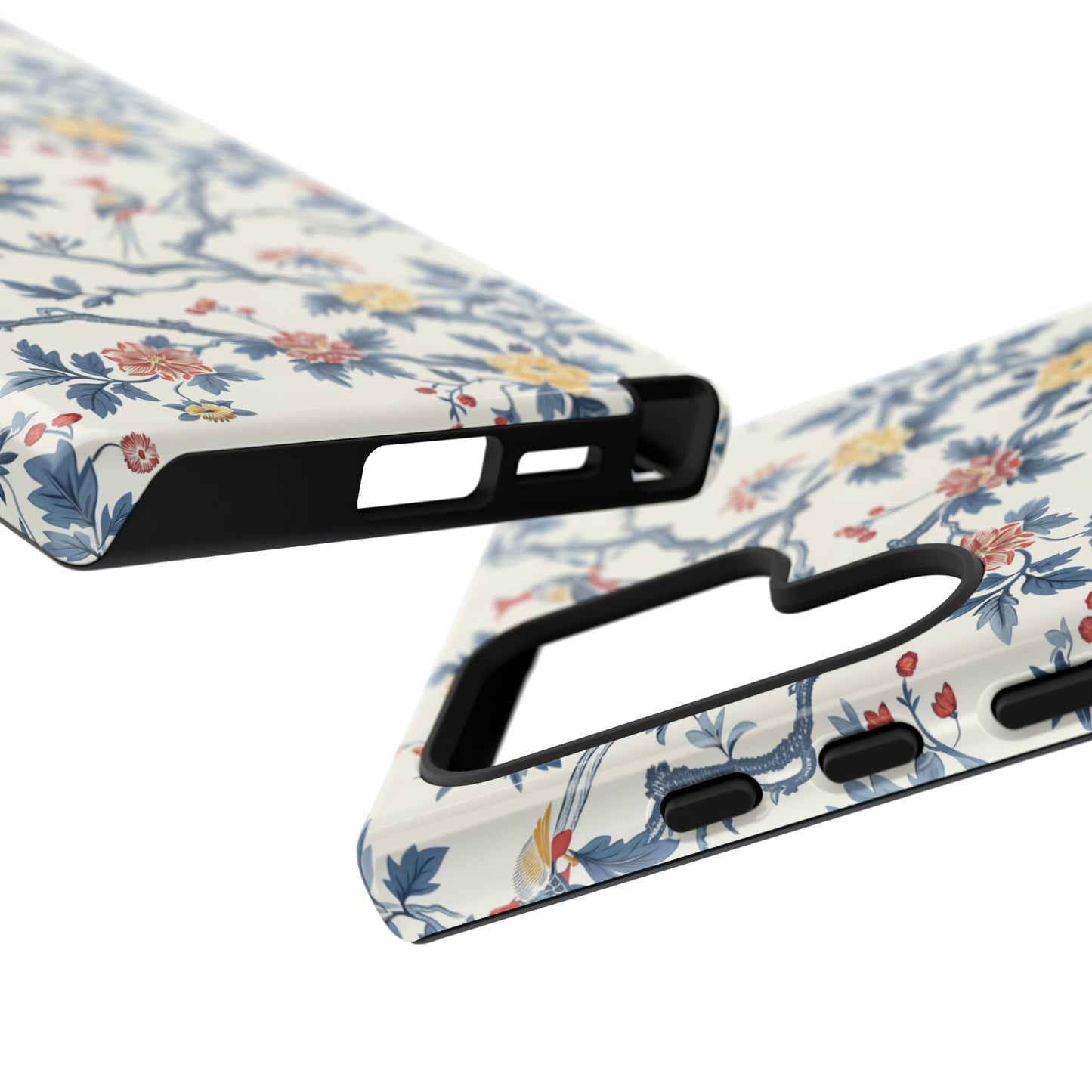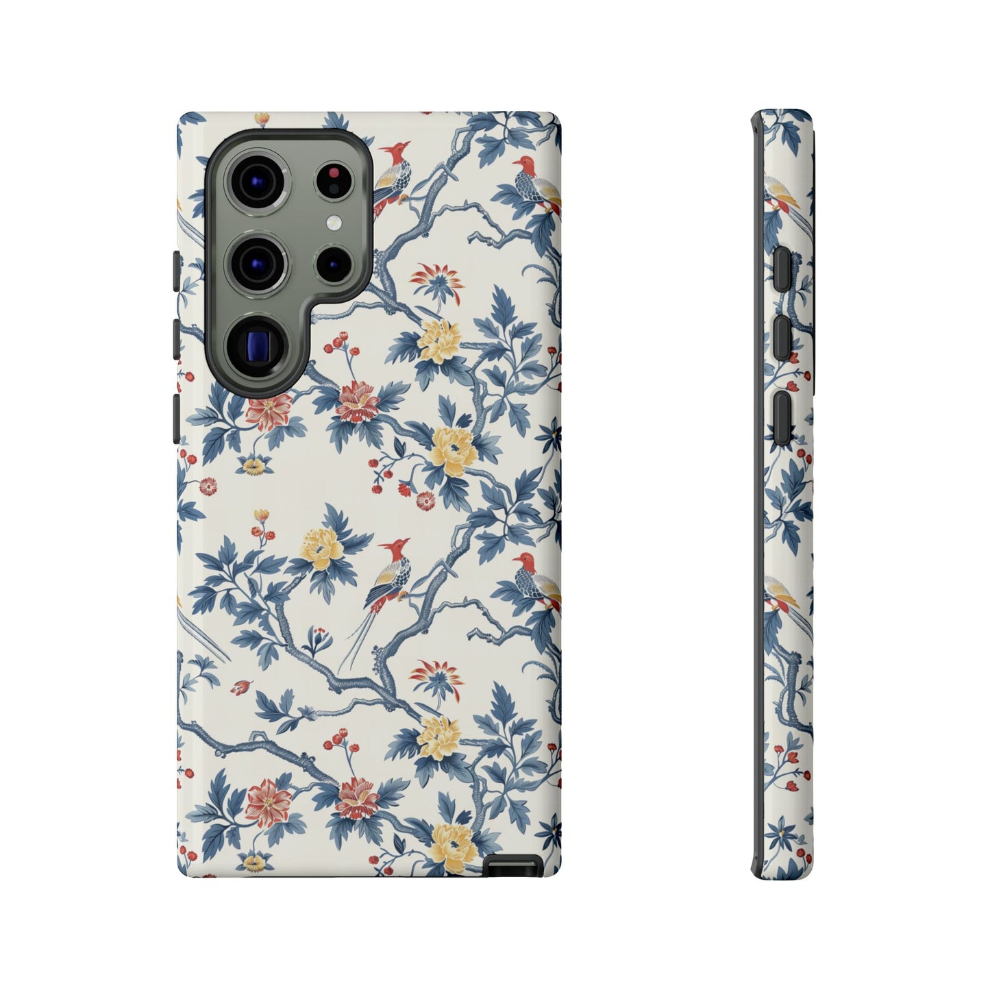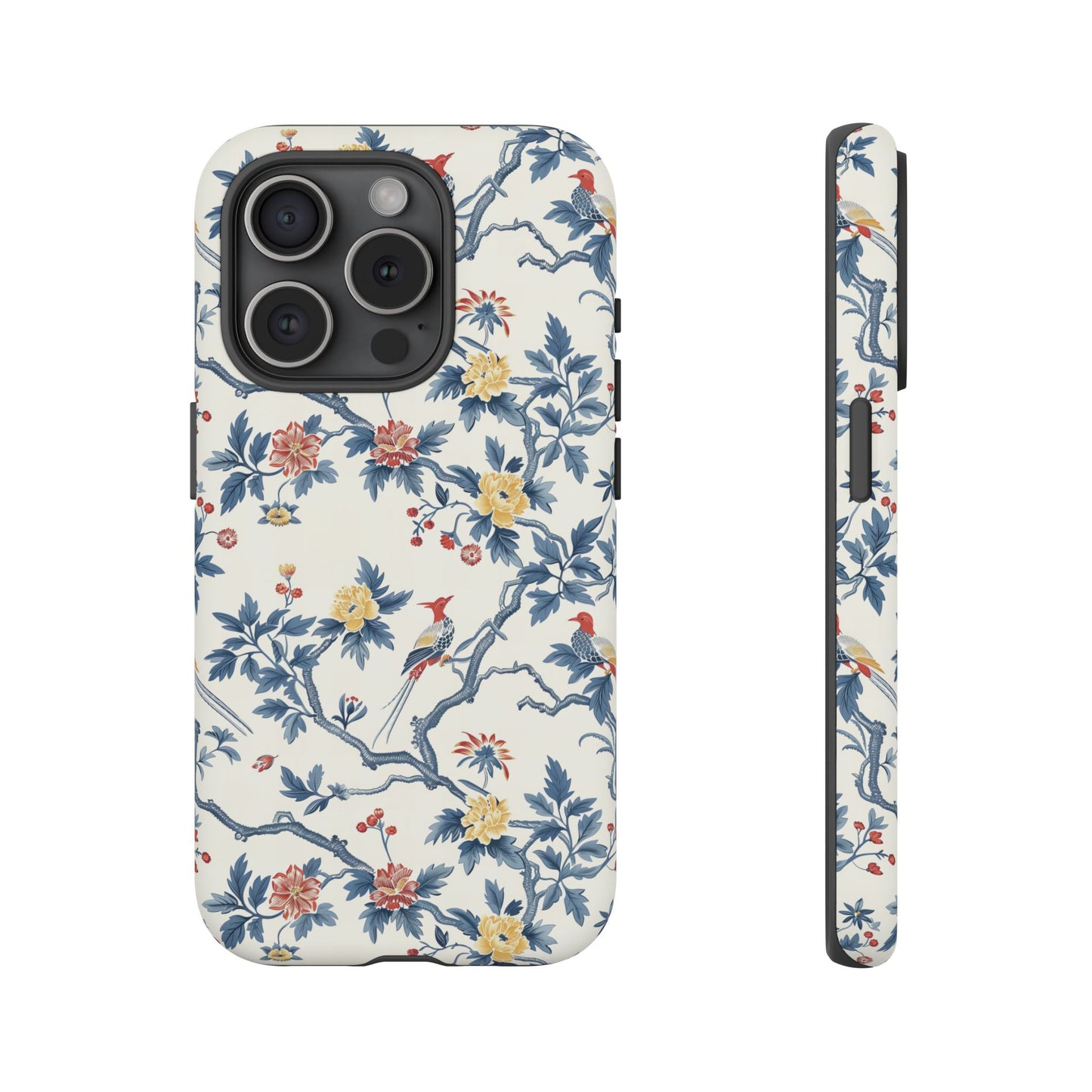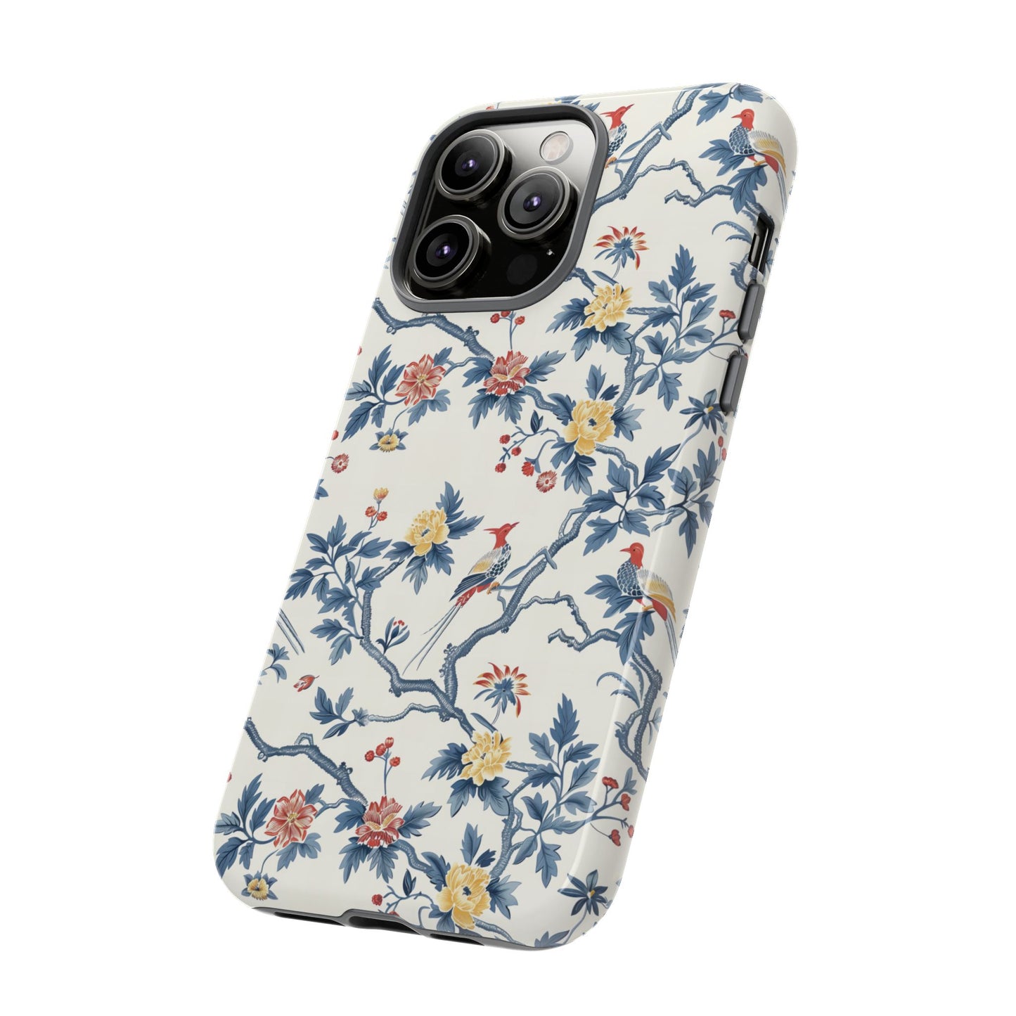 Elevate your phone's style and protection with our Durable Phone Case showcasing a captivating chinoiserie-inspired print. Adorned with a lush, botanical pattern of vibrant blooms, delicate birds, and graceful branches, this case adds a touch of refined elegance to your device. Crafted from high-quality, shock-absorbent materials, it provides reliable safeguarding against drops, scratches, and everyday wear and tear. The slim, lightweight design maintains a sleek, pocket-friendly profile without compromising durability. Whether you're a fan of classic Asian-inspired aesthetics or simply appreciate beautiful, nature-themed artwork, this phone case is sure to become a cherished accessory. Coordinate it with other chinoiserie-patterned home goods for a cohesive, cultured look.