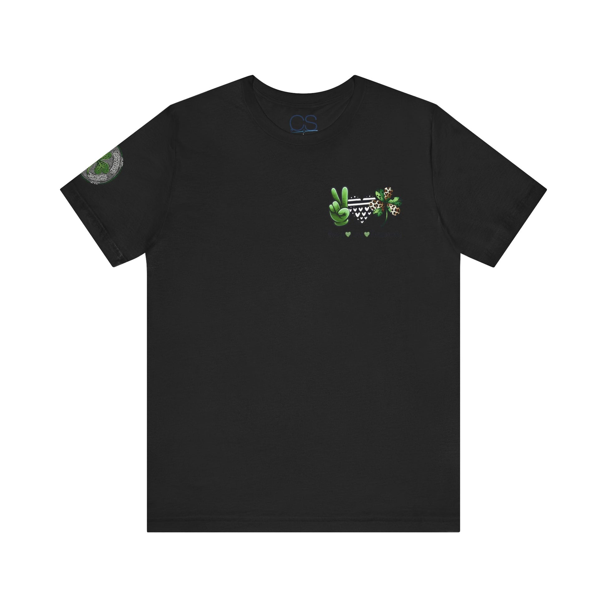 Discover twice the luck with our exclusive double-sided St. Patrick's Day t-shirt. The front features a charming "Peace Love Shamrocks" design with a modern twist, combining a peace sign, patterned heart, and decorative shamrock. The back showcases a vintage-inspired "Farm Fresh Four Leaf Clovers" design, complete with a classic Est. 1893 mark and a "Shenanigans Guaranteed" seal of approval.